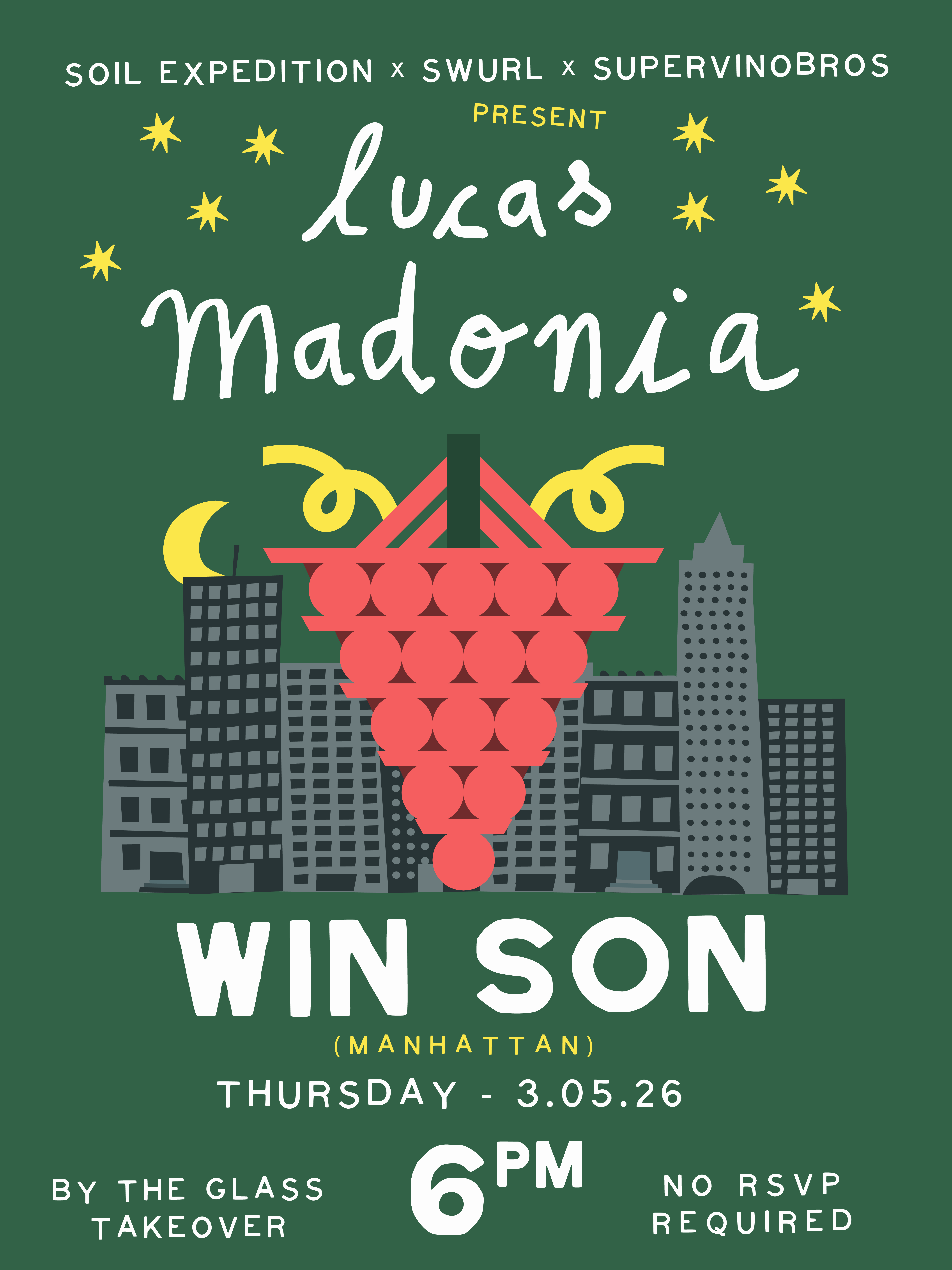 Tonight, Swiss winemaker Lucas Madonia will be joining us behind the bar, with our friend Drin on the music. In addition to a special by-the-glass and by-the-bottle list, we’ll also have $1 sliders with the purchase of any glass or bottle of wine.